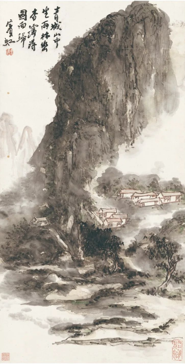 《青城山中坐雨》 黄宾虹 纸本 设色 纵86.4厘米 横44.6厘米 年代不详 浙江省博物馆藏