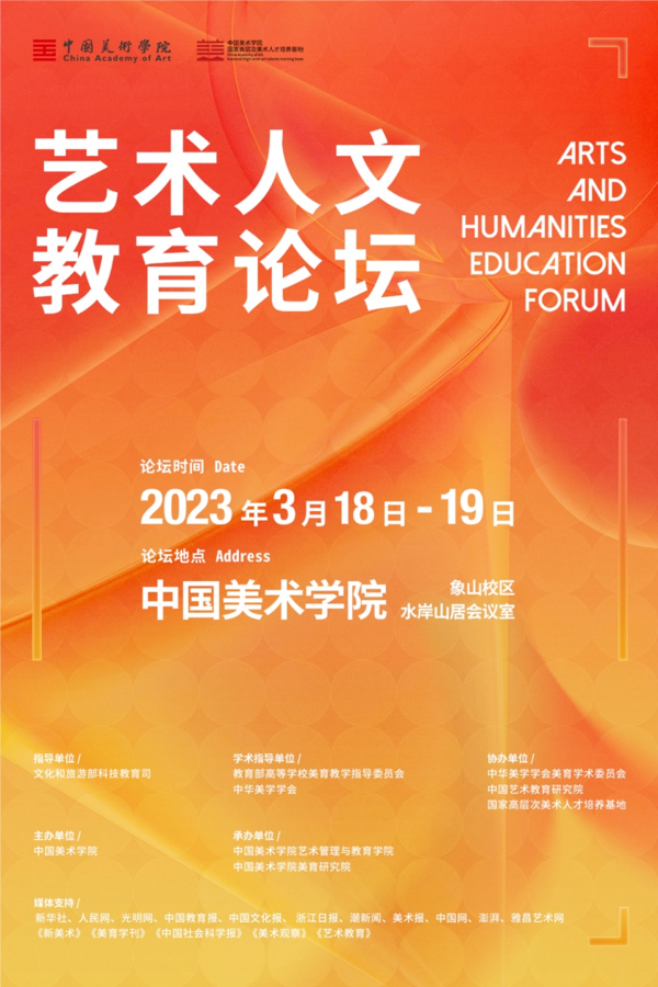 3月18日-19日,首届艺术人文教育论坛在中国美术学院召开。论坛由文化和旅游部科技教育司指导,中国美术学院主办,中国美术学院艺术管理与教育学院和美育研究院承办,旨在全面贯彻落实党的二十大精神,深入学习贯彻习近平总书记关于文化和美育工作、高等教育工作重要论述精神,弘扬艺术教育的人文精神,继承中国艺术教育的人文传统,发扬新时代的创造精神,促进艺术学科创新发展和育人体系完备,推动专业艺术院校的美育工作做深做强,全面提升学生的综合审美能力和人文素养。
