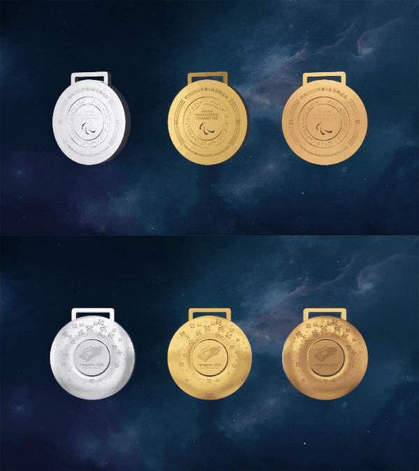 奖牌正面由桂花与杭州亚残运会会徽组合而成;背面采用了良渚神人兽面纹样装饰,以亚残奥委会标志为中心环绕盲文,具有很高的辨识度,其中盲文的释义为:杭州第4届亚残运会金牌(银牌、铜牌)。