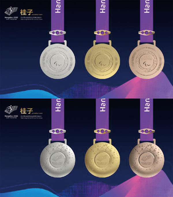 奖牌将良渚玉璧和杭州市花——桂花融为一体,以苍璧礼天,黄琮礼地,传递亚洲价值文化的多元和融合,以桂花的浓郁气质,表达办赛城市的热烈期盼,以“桂子”寓意运动员向往美好、积极进取的精神追求。
