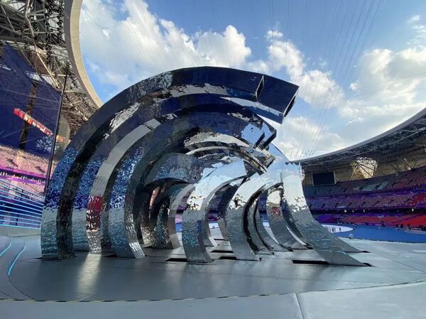 八月十八潮,壮观天下无。钱塘潮是天下少有的壮阔景观,它也代表了浙江的精神。第19届亚运会开幕正直大潮之时,运用抽象雕塑的手法,取潮水之型塑之,使之凝固。它整体采用的材质为不锈钢镜面水波纹板。杭州亚运会主火炬是一项艺术与科技的结晶,主火炬总高19米,由19跟立柱组成,象征2022杭州第十九届亚运会。每一根造型由低到高,由远到近、争先恐后、此起彼伏、犹如后浪推动前浪,寓意更高更快更强的体育精神。火炬点火时先点燃末端,火如潮水般涌向主火炬,薪火传承,勇立潮头!它不仅代表着杭州这座城市的独特魅力,还将点燃激情,传递梦想,成为这场盛会的亮点之一。