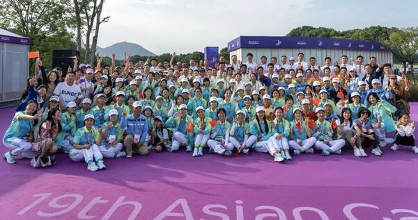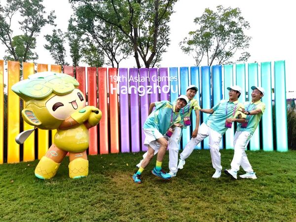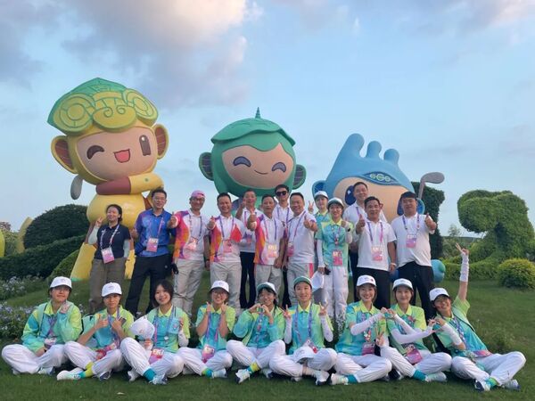亚运会高尔夫球项目颁奖仪式上,国美“小青荷”与获奖运动员合影