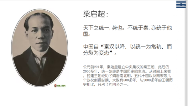 梁启超对中国历史进行总结并指出“中国自秦以降,以统一为常态,而分裂为变态”。从秦始皇建立第一个统一的封建王朝——秦,“书同文、车同轨、量同衡、行同伦”,到汉武帝、宋武帝、唐太宗、元世祖、明成祖、清圣祖……封建王朝的最高统治者不断开疆拓土,实现一统天下的雄图霸业。