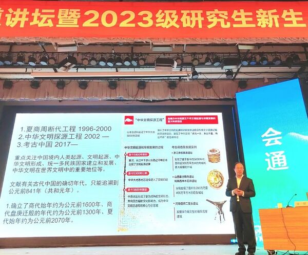 10月13日下午,校党委书记金一斌为2023级研究生讲授《中华文明之统一性》新生第一课,带领他们共同领略中华文明统一性的演进历程、丰富内涵和重大价值,勉励同学们传承爱国基因,挥洒青春艺笔,担当复兴重任。