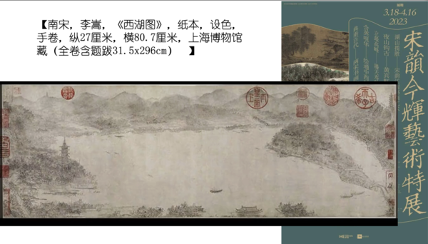 比如两宋时代文化昌明、秉持正统,前迈汉唐、后启明清,诗、书、画熔为一炉,创造了大量影响千年的伟大绘画。而北宋和南宋的绘画,也有很多不同,比如在构图上,北宋多为“全景式”的宏大式构图,南宋则走向了边角之景的小景布局,“马一角”“夏半边”开创了中国山水画的新的观照方式和表现技法。再如“南宋四大家”之首的李唐,横贯北、南两宋画院,随着宋室的南渡,为了适应江南的环境和风物,李唐的作品风格也发生了转变,从工整细致、繁密丰健的山水画风转变为简率疏放,更加强调人物和情节的刻画、融入情感、细腻又不失刚劲的新画风。江南之地与宋代之际相互成就,让宋韵成为最具江南辨识度的文化名片。