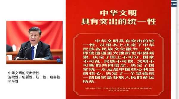 金一斌带领同学们重温了习近平总书记在文化传承发展座谈会上对中华文明的深刻阐释。中华文明具有五种突出特性:连续性、创新性、统一性、包容性、和平性。其中的统一性,从根本上决定了中华民族各民族文化融为一体、即使遭遇重大挫折也牢固凝聚,决定了国土不可分、国家不可乱、民族不可散、文明不可断的共同信念,决定了国家统一永远是中国核心利益的核心,决定了一个坚强统一的国家是各族人民的命运所系。