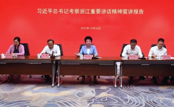 黄莉新说,学习好领会好贯彻好习近平总书记考察浙江重要讲话精神,中国美院大有可为、大有作为。希望中国美院牢记总书记殷殷嘱托,始终锚定世界一流美术学院目标,矢志当好勇攀高峰勇立潮头先行者;希望广大教师弘扬爱国为民崇德尚艺传统,坚持树牢学高为师德高为范好榜样;希望广大同学强化民族复兴强国有我担当,不断展现品学兼修堪当大任新风采,在奋力谱写中国式现代化浙江新篇章中展现担当作为。