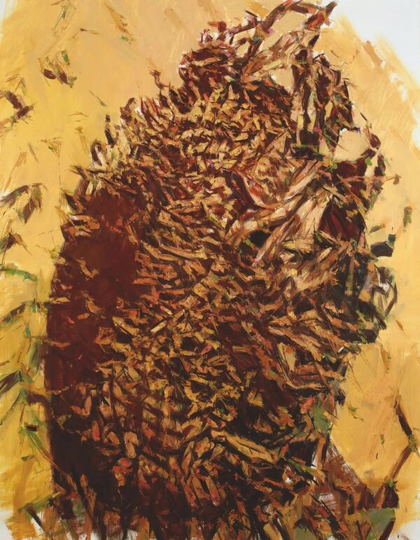 许江笔下的葵总是成片出现。即使是独立的葵头,也多以成组的形式展出。群葵簇拥,聚成排山倒海的气势。