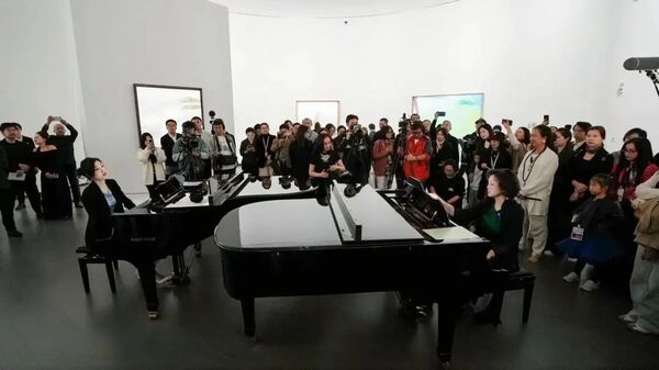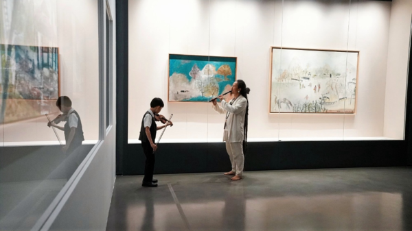 论坛第二板块是8日晚间的特别演出“无极·音画之夜”音乐会,由上海音乐学院钢琴教授、中国美术学院博士候选人孙韵策划,近20位艺术家来到中国美术学院美术馆“大道无极:赵无极百年回顾特展”现场联袂呈现了一场具有实验性质、肆意挥洒的即兴演出。“无极·音画之夜”将音乐带进美术馆,观众们跟随神秘的“讲述者”,穿梭于赵无极不同时期的画作间,同时聆赏时而低沉、时而平静、时而激昂的音乐,体悟着“两个传统、融会共生、如镜他山、无限生机”这四幕的意蕴,相融着音与画在同一场域的回荡和呼应,沉浸式感受视听艺术之间的通感联动。