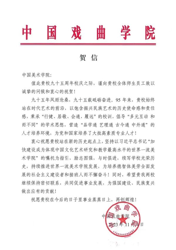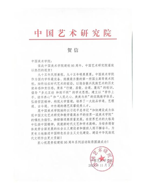 中国美术馆、浙江大学、南京大学、上海交通大学、中国科学技术大学、东南大学、同济大学、上海外国语学院、中国传媒大学、中央美术学院、中央戏剧学院、中国戏曲学院、北京电影学院、西安美术学院、湖北美术学院、鲁迅美术学院、山东艺术学院、中国艺术研究院、宁波大学、浙江理工大学、燕山大学、景德镇陶瓷大学等22家海内外单位发来贺信,共祝中国美术学院建校95周年系列学术活动圆满成功。