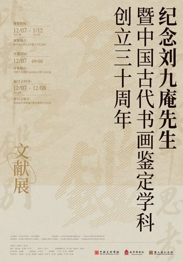 12月7日至8日,由中国美术学院、故宫博物院共同主办,中国美术学院潘天寿纪念馆、中国画学研究所承办的“纪念刘九庵先生暨中国古代书画鉴定学科创立三十周年”学术活动在中国美术学院举行。活动包括“纪念刘九庵先生暨中国古代书画鉴定学科创立三十周年文献展”和“纪念刘九庵先生暨中国古代书画鉴定学科创立三十周年学术研讨会”两部分。