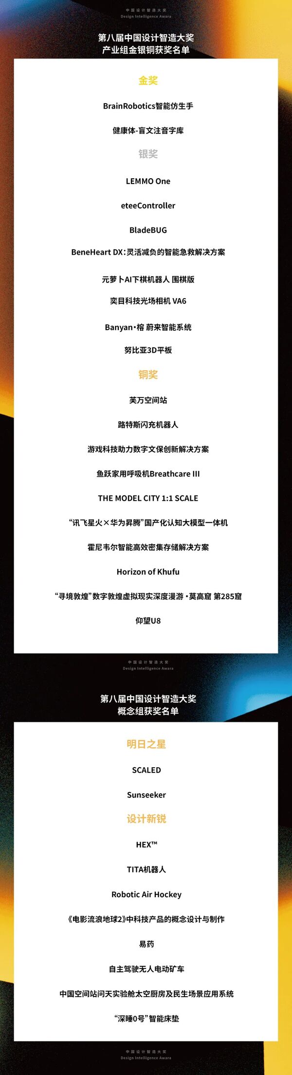 2023中国设计智造大奖(Design Intelligence Award,简称“DIA”)颁奖盛典于12月15日在中国美术学院良渚校区盛大举行,来自阿里健康科技(中国)有限公司的作品“健康体-盲文注音字库”和来自浙江强脑科技有限公司的作品“BrainRobotics智能仿生手”荣获最高奖——金奖。典礼上,中国设计智造大奖2024年度重点项目“DIA工程”发布,2024DIA全球征集启动。