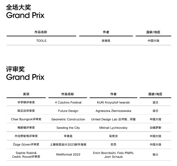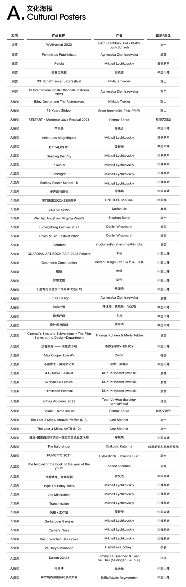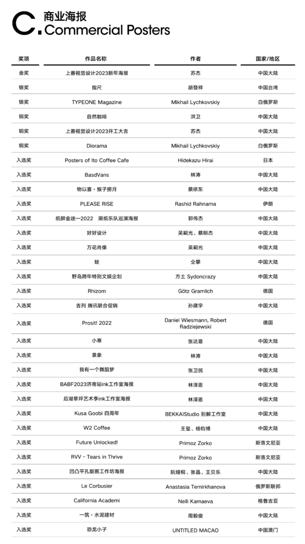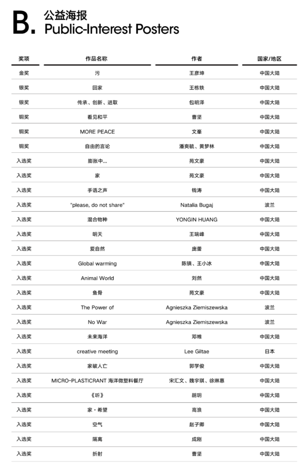 经初评,选出119件入选作品,其中,文化海报60件,公益海报27件,商业海报32件。12月17日,由国际评审团进行终评,共评选出全场大奖1件,金奖3件,银奖6件,铜奖9件以及评审奖7件。