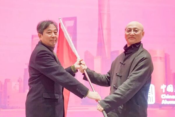 上海校友会第一届理事会秘书长金大鹏与新任会长曾成钢进行会旗交接