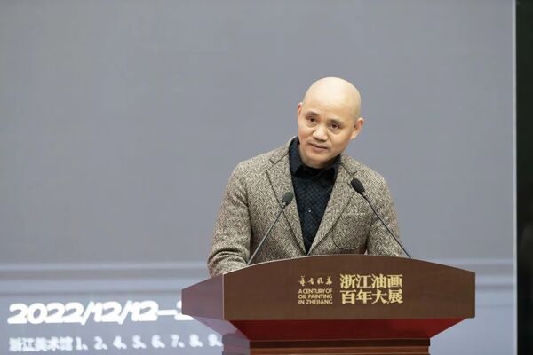 何红舟代表参展艺术家发言,他认为,“浙江油画百年大展”汇集了浙江数代油画家们的作品,展示了浙江油画的发展历史,体现了不同时期浙江油画家辛勤耕耘的足迹。浙江油画发展的脉络,一条是建校初期的具有表现主义绘画特色与中国文人精神的绘画道路,另一条是新中国成立后具有现实主义精神的写实油画传统,两条脉络不时交织缠绕,共同构成了浙江油画的底蕴。在各个历史时期,浙江油画艺术家们肩负使命担当,以关怀天下的普世精神创作了许多令人过目难忘的历史与主题性油画。进入新世纪以来,浙江油画语言的积淀在重大题材美术创作中焕发出活力。我们相信,油画在讲好中国故事,展现艺术家的创造力方面大有可为。