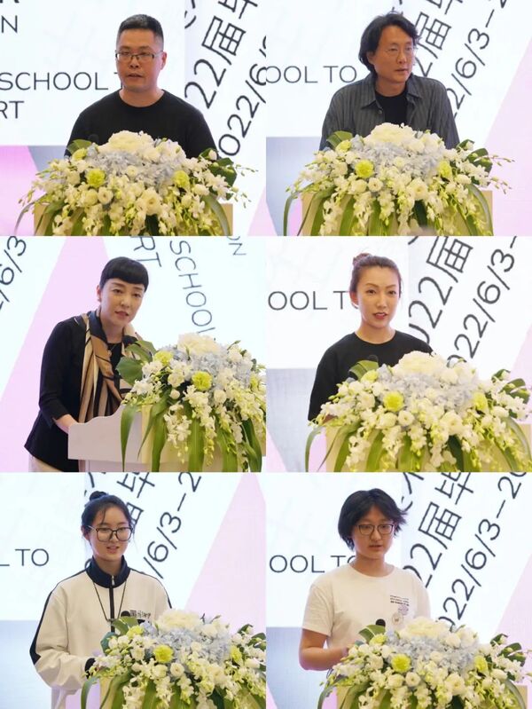 附中专业教研室主任、本次展览策展人杨正,AIP国际艺术教育总负责人刘昕,教师代表房爱、杨洋,学生代表宋天悦、刘昕妍发言