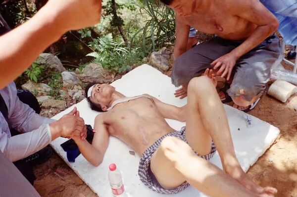 还有一次更令人心惊胆跳。溶洞里有场戏,一群人集结出发之前,大家围着火堆上的陶罐子说话。罐子里是烧着沸水的,拍的时候突然就炸开了,陈伟鑫离得最近,100度的水直接就泼到了他脚背上,一层皮全没了。 但是第二天要拍水里的戏,那我说用替身吧,陈伟鑫就不同意,他让医生给脚上抹了药膏,用保鲜膜把整个脚包的像木乃伊一样,然后再下水。