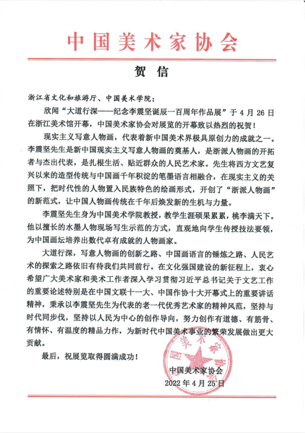 新世纪以来,美院中国画作为学院的高端之系,举办了众多卓有影响的学术活动。其中既有夯实中国绘画本体、重返文化望境与经典之学、重塑传统山河之念和文化自信的注重本土关怀的系列活动,又有侧重现实主义情怀、深扎时代大地、开掘以形写神的传统意象新生面的创作工程;既有强调笔墨传统与笔墨生机的深化研究,又有以充满诗意的山水风神对美术学学科整体的精神滋养。在这里边,浙派人物画,它的开创与持续发展,成为浙江人文学术梳理和讨论的、让我们不断重返、逐跡运思的一个源点。浙派人物画的五老将相续百年纪念,而李震坚先生是其中最年长者,也是最早的先驱。五老的百年纪念,将自李震坚先生始。今天,“大道行深——纪念李震坚诞辰百年作品展”隆重开幕,具有特别的意义。往圣采经典,先师垂教范。在这里,我代表浙江省文联向展览开幕表示热烈祝贺,并向近现代浙江人物绘画改革的一代先驱李震坚先生表达深深的敬意。