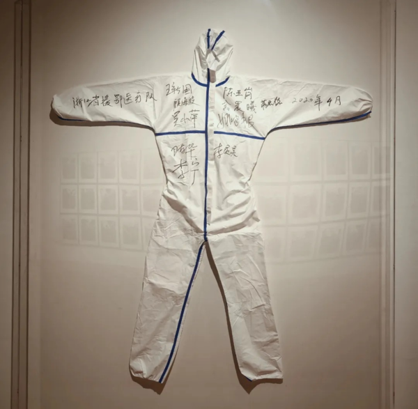 “众志赞歌”展览展出了陈亚岗向中国美术学院捐赠带有十位浙江省第三批援鄂医疗队医护工作者签名的防护服。