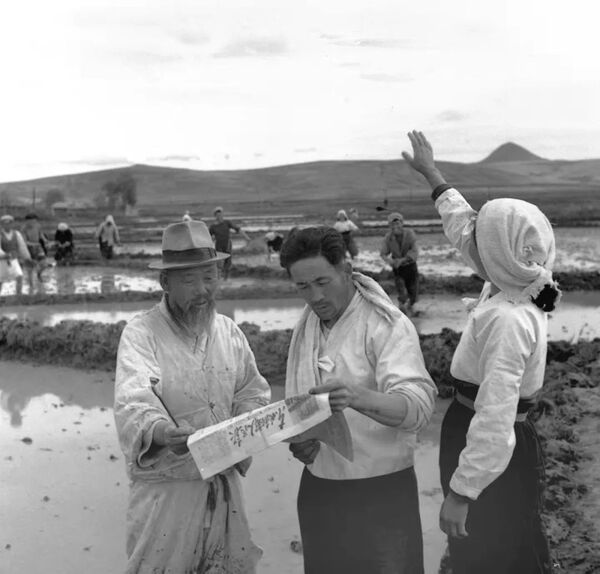 1954年6月26日,“中华人民共和国宪法草案”公布的消息传到了吉林省延边朝鲜族自治区,正在田间劳动的崔竹松农业生产合作社社员们争相赶来阅读公布宪法草案的好消息。