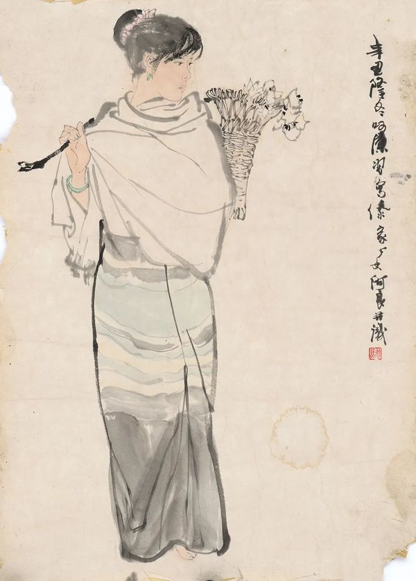 吴永良老师的画作中,令我印象最深的是他笔下的鲁迅。鲁迅先生是二十世纪美术史上的重要题材,画过鲁迅的优秀画家不知凡几,而吴老师却独辟蹊径,塑造出了特色鲜明的鲁迅形象。他1962年的毕业创作纯以白描手法表现,鲁迅先生负手而立,堂堂正正,磊落从容,背后两株高大的枣树自然是来自《野草》中的叙述。画面布局疏密有度,无论是人物的疏朗峻拔,惜墨如金,还是草木的绵密紧致,条理分明,都显示出其造型的坚实精准、笔法的简净洗练。