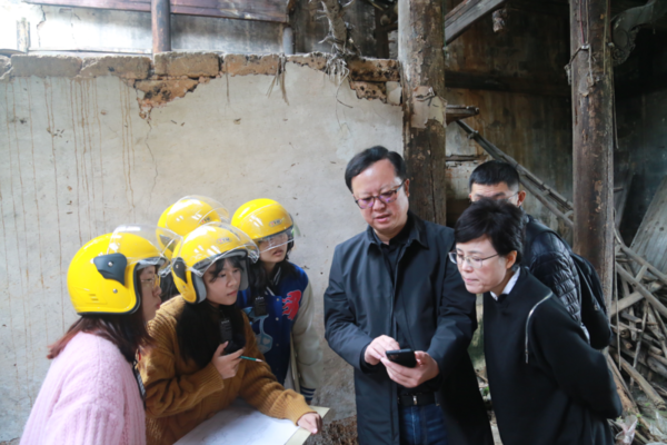 孙旭东一行到龙游县泽随村,看望正在开展古民居测绘工作的下乡师生,并开展现场思政课教学。孙旭东希望同学们践行“以乡土为学院”的教学理念,走出课堂,深入乡村,体察国情民情。他以梁思成、林徽因对中国古建筑不懈的研究和保护为例,勉励同学们克服困难,努力提高自己的专业素养,投身传统建筑与文化的传承和保护,增强“文化自信”。