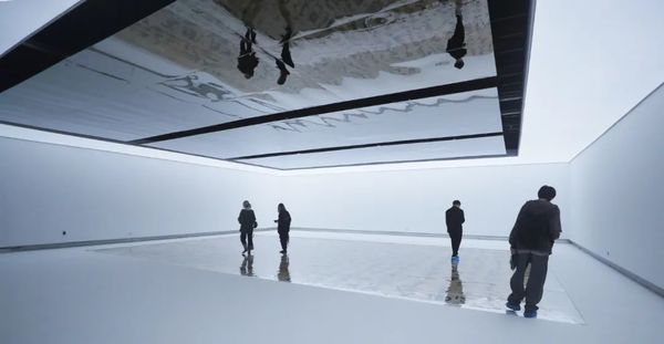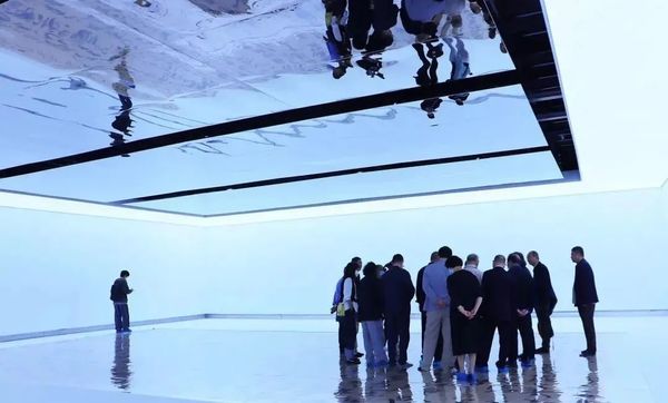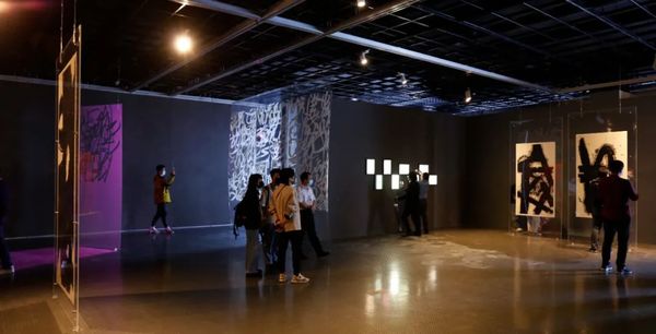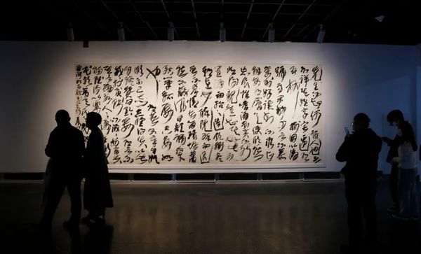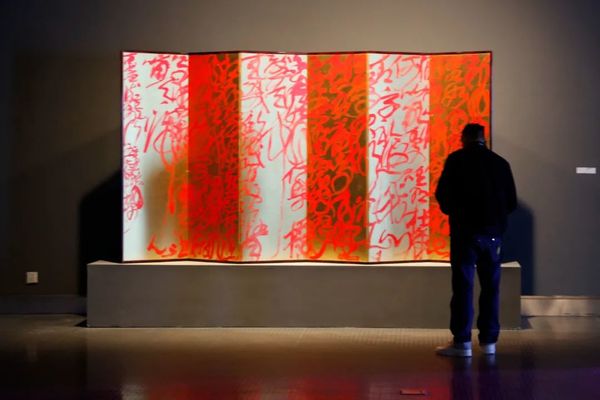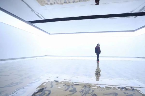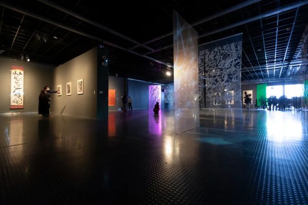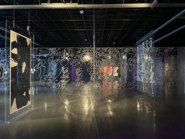 阔约大厅中,23幅长9米、距地面2.5米的《道德经》从天而降,宛若碑林下坠,星盘纵横。6号厅中,王冬龄特于今年教师节新创《论语》附于长22.1米、高2.45米、厚0.4米的曲面墙上,此草书巨幛是艺术家对孔子逝世2500周年的真诚致敬。巨书《维摩诘经》与12条书法条屏萦绕,促成一次横跨六十年的同框。5号厅则可窥艺术家深厚传统功力,诸多作品透过类似佛龛的窗口营造出双层书法空间,知来处,方晓去处。天光长廊竹影迷离,4号厅琉璃辉映。水墨抽象、银盐书法、镜面不锈钢书作等将王冬龄多年对书写的理解淋漓释放。长12米、高7.5米的巨制《逍遥游》上空,漂浮着增强现实技术展现的数字空间,漂若银钩惊鸾,生熟逸趣纵流。
