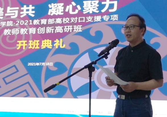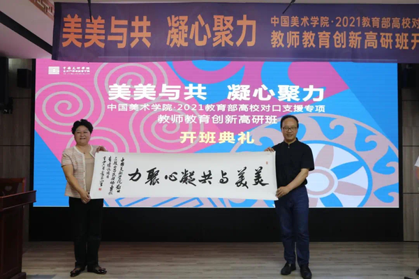18日,中国美术学院•2021教育部高校对口支援专项—美术教师教育创新高研班正式开班,开班典礼上我校金一斌书记致辞并赠送我校戴家妙教授书法题字:“美美与共 凝心聚力”,西昌民族幼专党委书记石芳、校长赵波分别致欢迎词和答谢词,副校长成国志主持仪式,中国美术学院李梅教授就本次培训教学内容安排及培训意义作简概阐述。