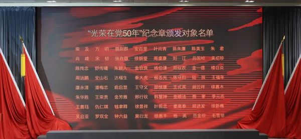 6月15日,中国美术学院举办“光荣在党50年”纪念章颁发仪式,64名老党员获纪念章。校党委书记金一斌,副书记孙旭东,党委委员、组织人事(统战)部部长徐国强,“光荣在党50年”老党员及部分家属代表出席仪式,党委副书记刘正主持仪式。各党总支、直属党支部书记(副书记)、党务部门负责人、组织员、全体毕业生党员参加仪式。