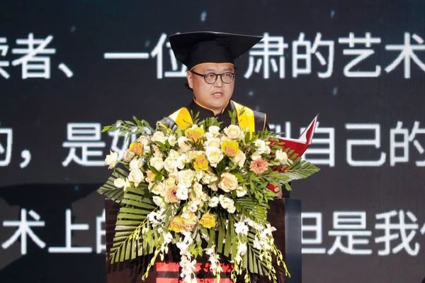 院长高世名以《同道》为题讲话,他与毕业生们分享了油画系老教授金一德与“八五新潮”代表人物、我校教师耿建翌的故事。高世名指出,在一个学院家族和学术谱系中,激励我们的是一些独特的个人,他们的人生都指向一些共同的东西:有情有义的知识,身心俱足的思想,知行合一的创造,独立自主的人格。正是这些东西,涤荡着我们的心胸,正是这些东西,使我们成为“同道中人”。这“道”是文以载道的“道”,是技进乎道的“道”,也是“东西调和”“传统出新”“博约弘毅”“为艺术战”“四通”“哲匠”“行健、居敬、会通、履远”“大学望境”的国美之“道”。