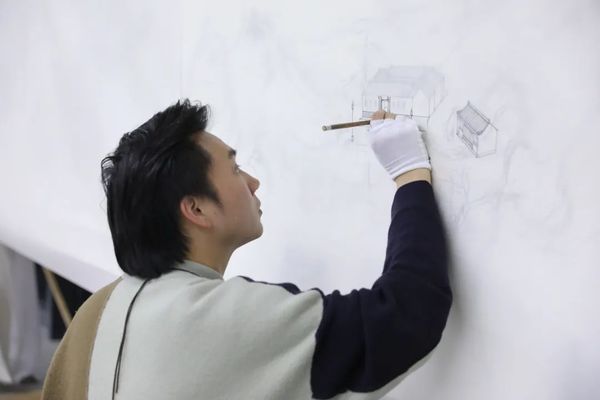 考察结束后,寒假期间进行人物稿的绘制。近现代人物形象有照片作为参考,形象容易确立,而古代人物的形象往往是结合文字资料中所表现出的人物个性和状态进行创作。人物年代上至魏晋南北朝,下至明清,地位高至帝王将相,低至贩夫走卒,服饰大到一件衣袍小至一双鞋履,以及场景中的器具都是通过服饰史以及古画资料研究得来。同期,山水建筑小稿进一步深入,细细揣摩经营位置,使布局合宜,同时画面也完成了大构图的绘制。