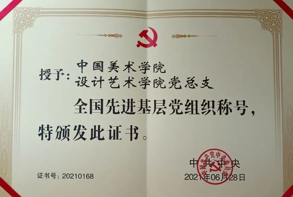 在中国共产党成立100周年之际,党中央隆重表彰全国优秀共产党员、全国优秀党务工作者和全国先进基层党组织。中国美术学院设计艺术学院党总支被授予“全国先进基层党组织”!
