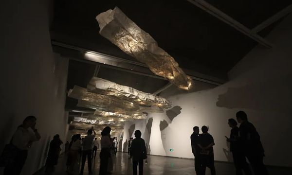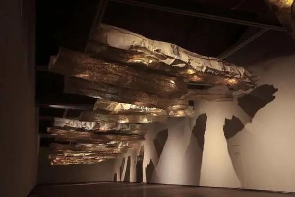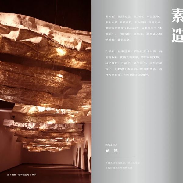 “素造”部分所展为施慧作品,由悬挂于顶的一系列纸浆作品组成。作品以“飘”为名,轻盈的纸浆蒙于铅锌丝网之上,纸与金属,一“轻”一“重”共构出飘逸之姿;而纸浆的纤维纹理与铁丝网格相辅相成,隐约透露着作为本质之素的编织天地的经纬之力。