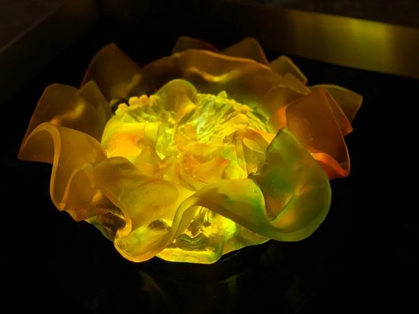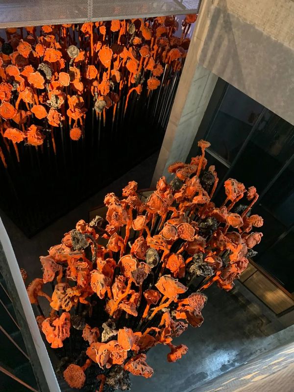 “赤炼”部分所展为许江作品,由数十个形态各异、倔强刚毅的铜铸葵盘以及十数只金辉流转、华光璀璨的琉璃葵盘组成。作为“一”,每一葵盘都姿态独具、自藏万千丘壑;作为“群”,这一片葵盘皆颔首抱籽,历经沧桑仍满心炙热,刚毅肃穆亦饱含深情,汇聚出葵园大地的岁月荣光,熔铸成一代人的精神史诗。