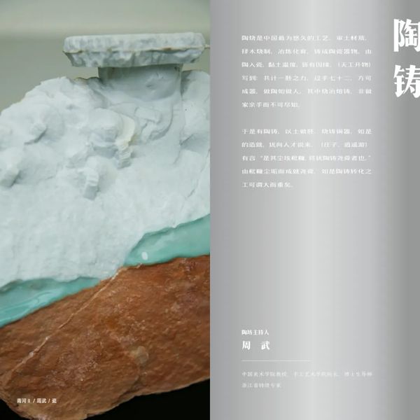 “陶铸”部分所展为周武作品,由十余件陶器和瓷器组成。陶器赤红如火,名曰“秋山”,如深秋层林尽染之风华;瓷器中嵌入天青之色,名曰“青河”,一片天青嵌于白棕二色之间,若天地间奔流之长河。陶铸转化之工在制物成器中显现,所谓“天工开物”,方寸之内亦有造化之力。这般造就,制物、做人皆如是。
