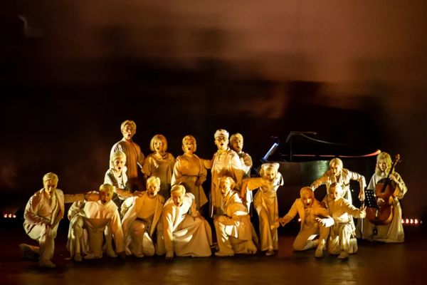 牟森是上世纪 80 年代中国戏剧探索道路上的先行者之一,他对该剧的定位是:“叙事性内容、歌唱性台词、雕塑性身体、总谱性歌唱。”因而,全剧的结构更接近于奏鸣曲,主要元素就是台上18位一专多能、一人多角的白衣演员;既具有叙事性又情感丰沛如电影音乐般的歌曲和音乐;兼具解说功能和视觉冲击的多媒体设计。这三大元素交汇出饱含情感、富有能量的“动态油画”“活动雕塑”等颇具仪式感、经典感的场面,也是对舞台视觉的美学重塑。