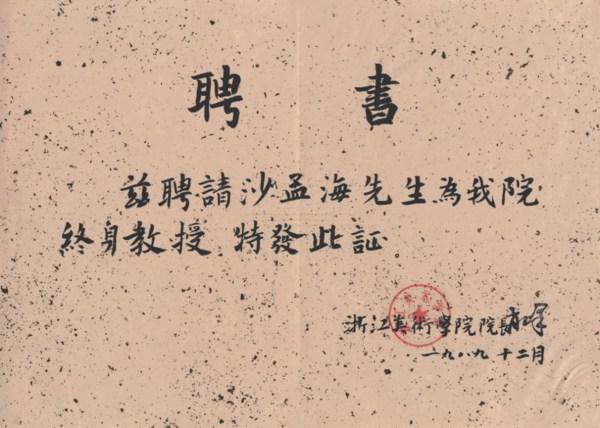 浙江美术学院聘请沙孟海先生为终身教授的聘书