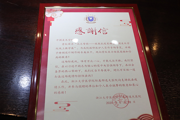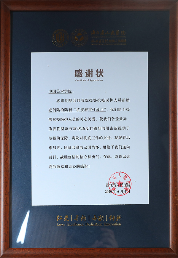 近日,我校党委书记钱晓芳、纪委书记孙旭东、副院长姜玉峰等领导先后赴浙江大学医学院附属第二医院、浙江大学医学院附属邵逸夫医院、浙江大学医学院附属第一医院、浙江省人民医院、浙江省卫生健康委员会等单位,将这一批印有每人姓名的2028条定制“抗疫主题纪念丝巾”赠予浙江援鄂医护工作者,表达全校师生对抗疫英雄的崇高敬意。受赠单位为中国美术学院在疫情期间组织的展览及主题创作致谢,并表示希望和学校进行艺术与设计美学方面的长期合作交流。