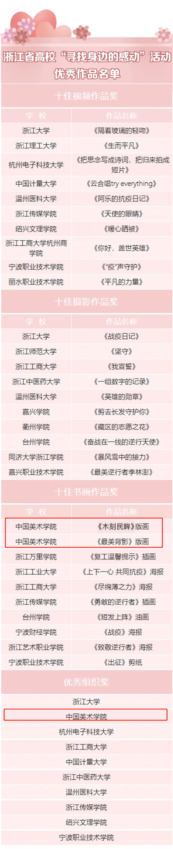 据悉,为深入落实立德树人根本任务,今年以来,省委宣传部、省教育厅、浙江广电集团联合在全省高校开展了“寻找身边的感动”活动,着力发现和宣传师生身边的先进典型,用具体的案列、鲜活的故事唱响主旋律、弘扬正能量。参赛作品通过视频、歌曲、照片、书画、海报、剪纸等形式,创作了5000余件作品,生动展现了我省高校附属医院医务工作者、师生志愿者、留学生、管理人员等在抗疫过程中的感动瞬间和感人事迹。先后在中国蓝新闻客户端等媒体平台刊发了146期,人民网、新华网、学习强国等主流媒体关注转发,阅读量超过1200万,向全社会传递了我省高校抗疫战疫的正能量。经专家评审,最终25所高校的30件作品获评优秀作品,10所高校被评为优秀组织奖。