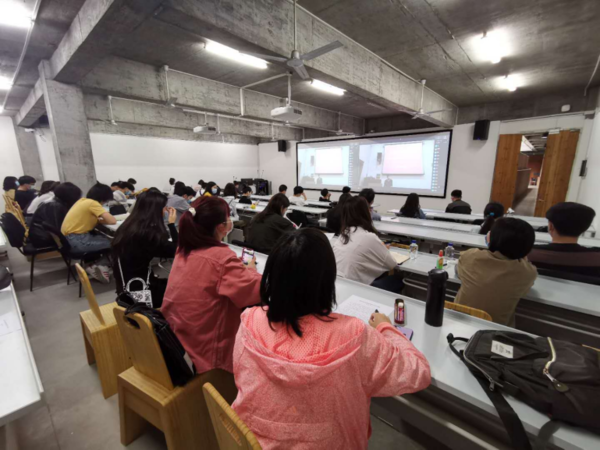 为了达到全员同步、安全完整的学习培训效果,建筑艺术学院采取线上线下相结合的方式,班长、心理委员等100人在主会场上课。其他分会场设在各班级教室,由学习委员负责组织,各个会场同步钉钉视频,期间还安排办公室老师巡查。既确保了第一课的效果,也做到了不大规模聚集。