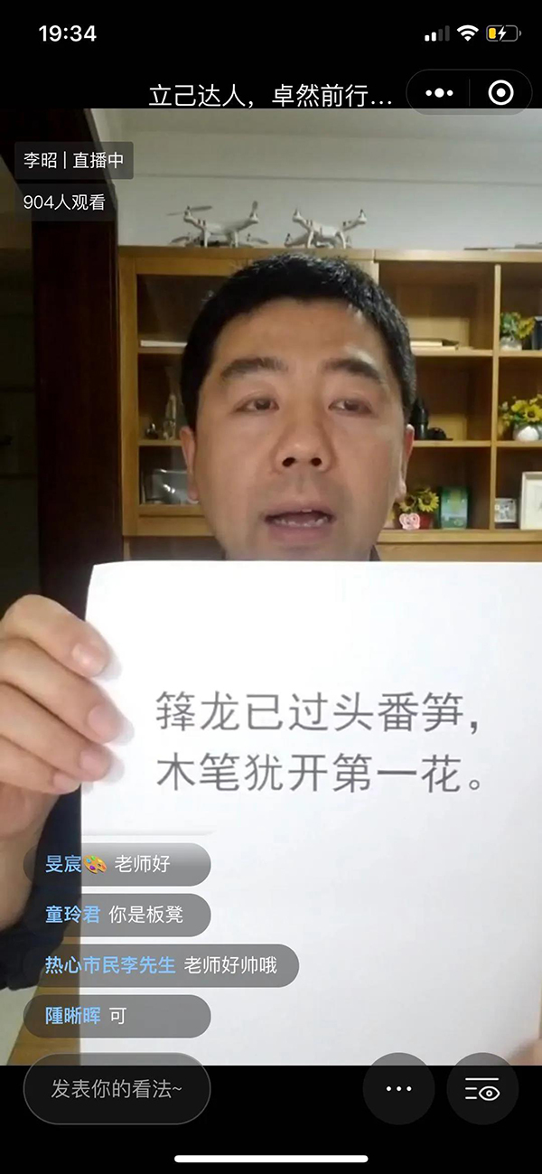 5月9日晚19点30分 ,专业基础教学部举行"立己达人、卓然前行——开学第一课",党总支副书记李昭带领全体同学一起走进直播间,通过线上形式按下复学重启键。李昭向每位同学发出了肺腑之言,他结合疫情期间一个个感人故事,引导同学们敬畏自然、珍爱生命,学会感恩,懂得奉献,肩负使命担当、拥有家国情怀。并对防控新规范进行解读,要求同学们自主学习,自主管理。用“‘课’不容缓,‘疫’不容‘驰’;‘鸢飞戾天,必先砺其翼、弦歌干云,须得厚攒聚。’”等要句,倡导同学们肩负新使命,树立新规范,重整新行装,再踏新征程。