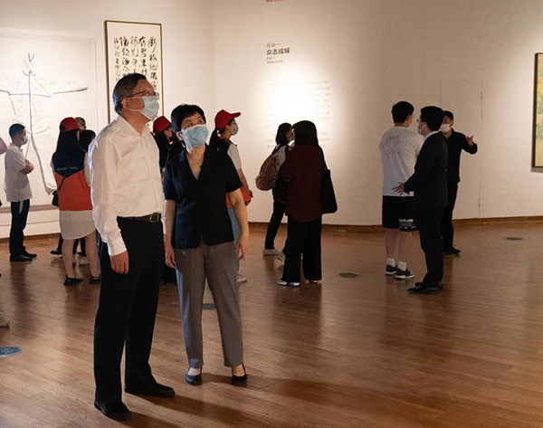 省政协副主席、邵逸夫医院院长蔡秀军,省教育厅党委书记、厅长陈根芳,省委宣传部副部长葛学斌,省文联党组书记陈瑶,省卫健委副主任、浙江医疗队指挥长曹启峰,邵逸夫医院党委书记、副院长、浙江省对口支援荆门抗疫指挥部常务副指挥长、浙江省赴荆门市医疗队队长刘利民,浙大二院常务副院长王伟林,省人民医院副院长、国家紧急医学救援队援鄂医疗队队长何强及80余位浙江援鄂医疗队医护工作者前来观展。校领导班子成员钱晓芳、许江、胡钟华、孙旭东、姜玉峰陪同。