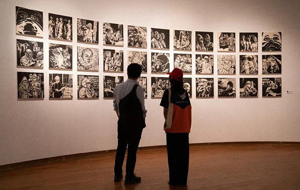 在展览现场,许江院长介绍,这是一场特殊的展览,展出了新冠疫情期间师生创作的作品。中国人民在党的坚强领导下联手战疫,同心保家,铁肩担当,红心向阳;医务工作者们的英勇义行,彰显出人性的光辉,使得师生的居家成为了一堂人生大课。这也是一场在工具和材料极其匮乏的情况下创作出来的展览。同学们默默习惯和接受用最简单、最基础的工具,以网上教学的方式记录自己的真情实感。在此过程中创作出来的作品,画幅虽小,却无比真诚,价值非凡。这还是一场用真心创作而成的展览。在疫情还未被完全控制时,师生们就已开始在网络上互相沟通、着手创作。展览中的一些大型作品,比如那200件版画组成的《木刻民眸》,表现了医务工作者们口罩上方坚定的目光;还有此刻身处期间的群雕,里面有“上医医国”的国士,有雷神山火神山的建造者,还有医疗队飘扬的旗帜,他们共同形成了英雄的山峰。展览是中国美术学院师生的心曲,也是献给战疫英雄的赞歌!