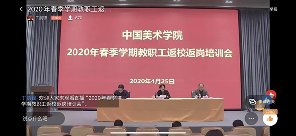 4月25日早上,中国美术学院召开2020年春季学期教职工返校返岗工作培训会。会议围绕“切实加强新型冠状病毒感染的肺炎疫情防控工作,坚决打赢疫情防控阻击战,扎实做好疫情期间返校返岗工作”主题,采用线上线下结合形式进行。除南山校区主会场外,另设象山校区视频分会场和钉钉群视频会议室。校党政领导、中层干部、全体教职员工1200余人参加培训会。
