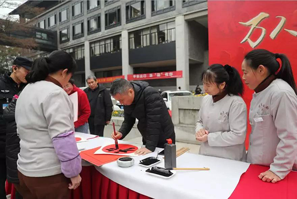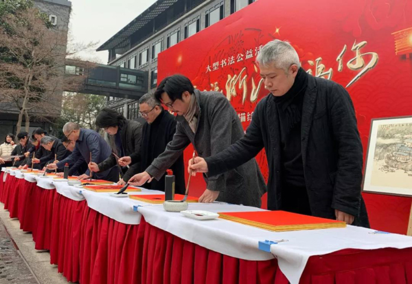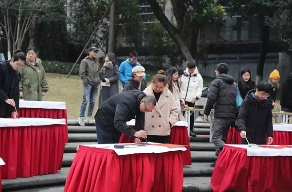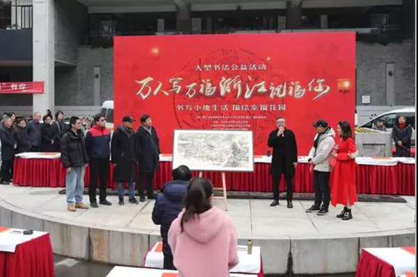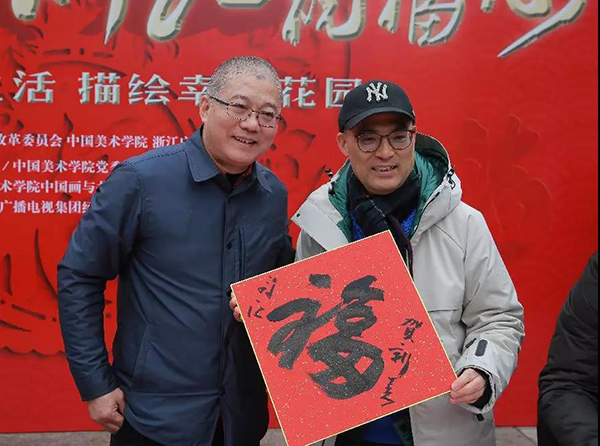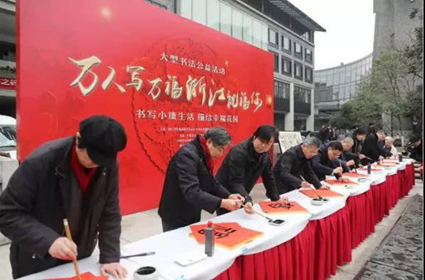 书写小康生活,描绘幸福花园,2020年“万人写万福,浙江祝福你”既书写祝福,也描绘浙江的美丽画卷。现场嘉宾、参与现场送福活动的中国美院师生挥斥方遒,把最美好的祝福通过书法的形式呈现。在农历新年的大年初一,中国美术学院中国画与书法艺术学院院长张捷带领博士和研究生团队一起创作的《我心中的浙江大花园》和今天所书写的“福”字,将在纽约林肯中心举行的“春之声中国新年音乐会”上展览,送去来自浙江大花园的美丽祝福。