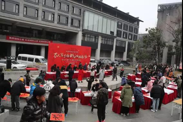 新春「送福」是中国美术学院在每年元旦时的特别活动,从2009年开始持续至今已是第十一个年头。今天是2020年的1月2日,农历的腊八节,书法送福活动一方面贴合新年到来的喜庆气氛,辞旧迎新,传递新春气息;另一方面,借名家书法宣扬传统书法国学,让更多的普通百姓能够感受到书法文化的魅力。