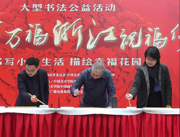 今天中午,由浙江省发展和改革委员会、中国美术学院、浙江广播电视集团主办,中国美术学院党委宣传部、中国画与书法艺术学院、浙江广播电视集团经视频道承办的「书写小康生活 描绘幸福花园“万人写万福 浙江祝福你”」大型书法公益活动在中国美术学院南山校区举行。