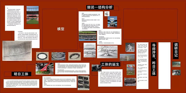 北京工人体育场,是新中国“十大建筑”之一,代表着当时新中国建筑设计师们对建筑新结构和新形式的探索,尤其是看台上方的混凝土大悬臂结构的设计和建造,在那个百废待兴的年代是具有很大挑战性的。同学们经过实地感受和调研这个建筑,收集了大量第一手资料,在此基础上对建筑剖面、构造以及节点进行仔细的分析和绘制,这也是我们学校建筑学专业中一条重要的教学线索及建构学研究的方向,是了解一个建筑物最基本的建造原理和结构表法的方式。同学们把关于这个建筑的调研资料一并整理后呈现在这个展览中,希望通过“我的祖国,我的建筑”调研展能够让大家感受到当年这些伟大建筑的诞生历程。