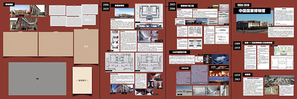 这里陈列的是建筑艺术学院师生对中国人民军事革命博物馆(简称军事博物馆)的学习认识。作为新中国“十大建筑”之一,军事博物馆是代表新中国军队建设与发展的标志性工程。其设计建造不仅反映了由苏联式建筑设计手法主导的时代特色,也培育了一处历久弥新的城市文化景观。同学们通过考察和研究发现:军事博物馆虽历经多次改扩建,但最初设定的庄严立面形象、绝无仅有的塔顶军徽、以及中轴对称的平面布局等因素却始终保持恒定。这种恒定不仅会使每一个参观者联想到人民军队的坚定和强大,也在北京城、乃至国家和民族的集体记忆深处培育了一处恒定的场所精神。基于此,同学们试图以线索合成的方式重新还原这一场所精神的成型过程,并在资料梳理和现场考察的过程中体味前辈设计大师在城市建筑营造中透露出的种种智慧。