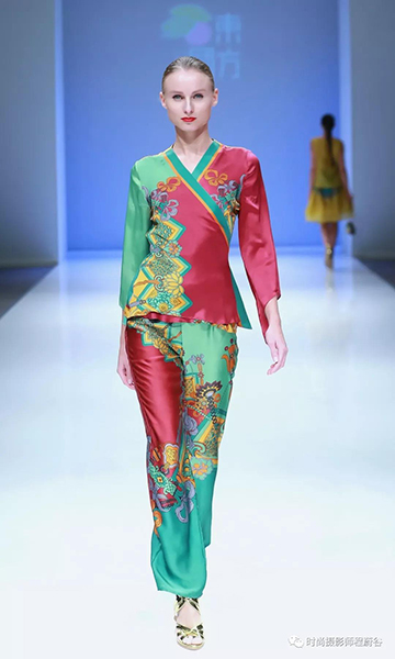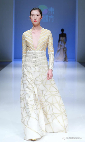 第二系列作品《东方盛世》,灵感源于中国明代壁画。经过对壁画纹样元素的提取与梳理、分析与研究、变化与设计,以今日时尚之形、时空之体、理念之引,载以数千年的中华丝绸、服饰、形制文化活化于当下时尚。